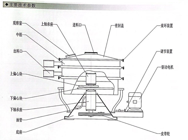 搖擺篩有進(jìn)料口、上蓋、篩網(wǎng)、觀察孔、篩框、密封圈、調(diào)整塊、彈簧、出料口、底座、電機、檢查孔、皮帶輪等主要組成部分,清網(wǎng)裝置有彈跳球、轉(zhuǎn)筒刷、超聲波等。在糧食、化工、醫(yī)藥、塑料、建材、飼料、化肥等多種行業(yè)中均有使用。